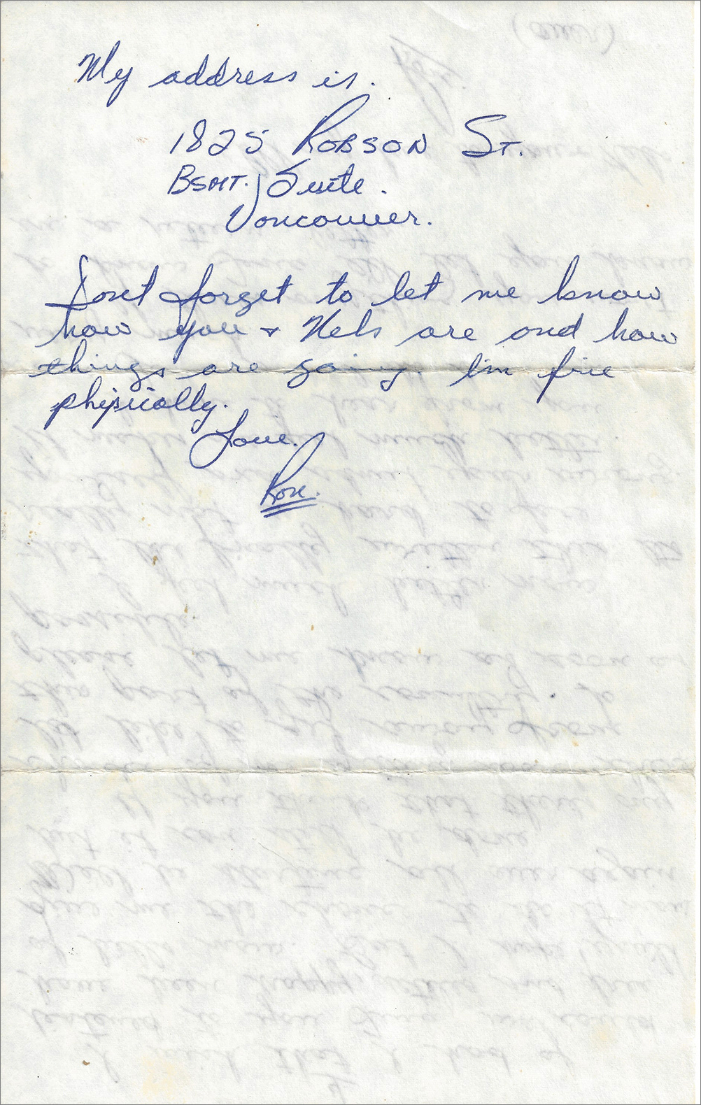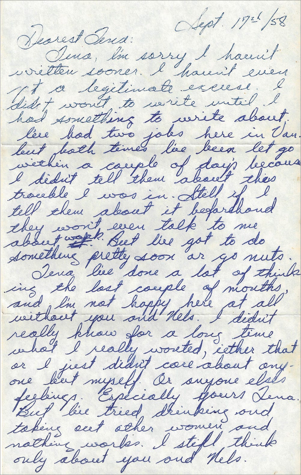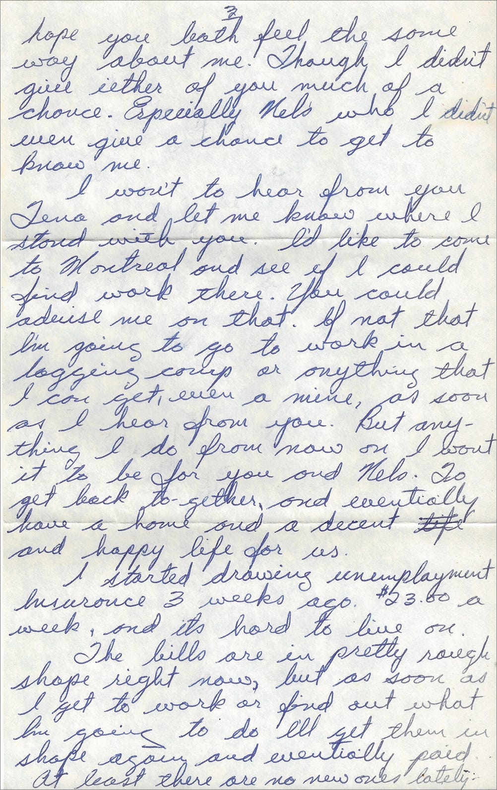 I won’t [sic] to hear from you Tena and let me know where I stand with you. I’d like to come to Montreal and see if I could find work there. You could advise me on that. If not that I’m going to go to work in a logging camp or anything that I can get, even a mine, as soon as I hear from you. But anything I do from now on I wont [sic] it to be for you and Nels. To get back together, and eventually have a home and a decent and happy life for us.