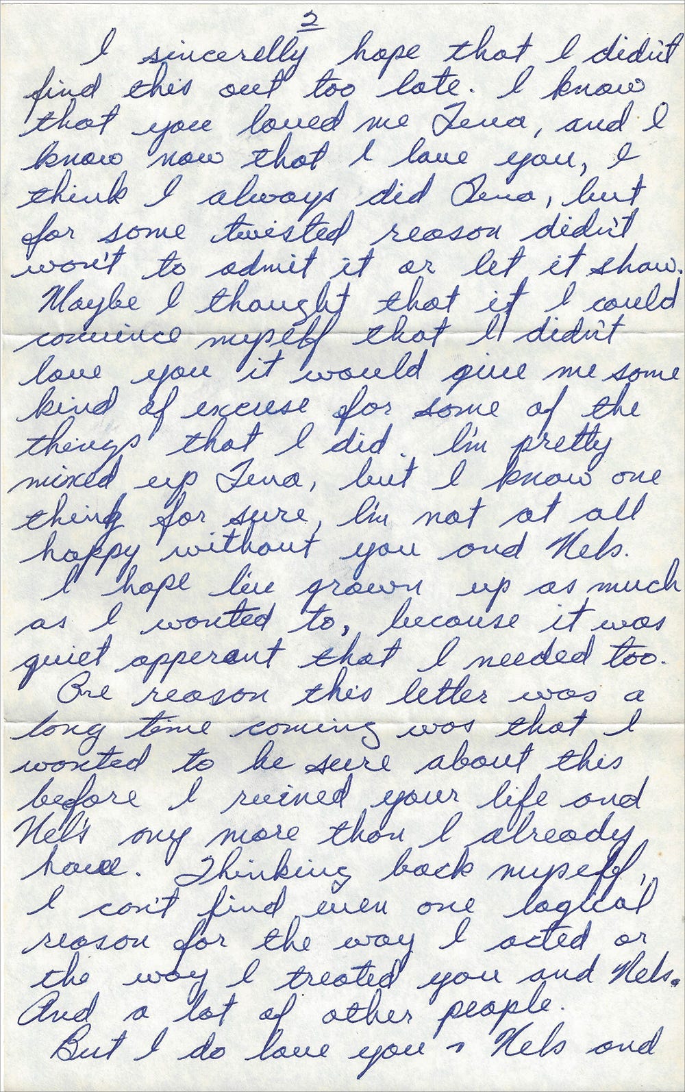 I sincerelly [sic] hope that I didn’t find this out too late. I know that you loved me Tena, and I know now that I love you, I think I always did Tena, but for some twisted reason didn’t won’t [sic] to admit it or let it show. Maybe if I thought that if I could convince myself that I didn’t love you it would give me some kind of excuse for some of the things that I did. I’m pretty mixed up Tena, but I know one thing for sure, I’m not at all happy without you and Nels.