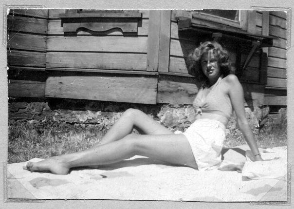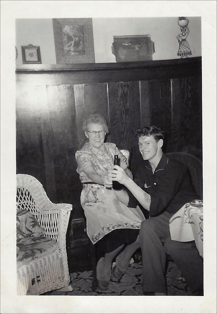 My grandmother appears to have liked him—he must have been charming indeed. While retouching this photo I noticed that his hand is around her wrist, as though she was grabbing for his beer bottle and he was stopping her. My grandmother didn’t drink.