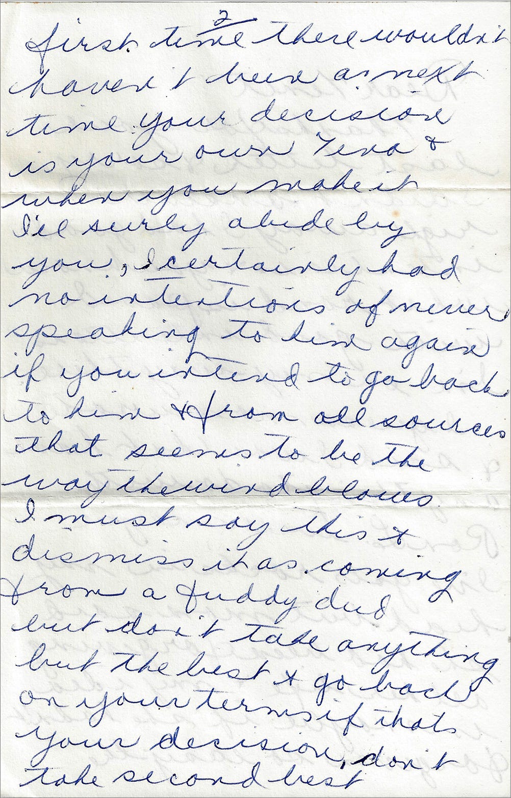 I must say this & dismiss it as coming from a fuddy dud but don’t take anything but the best & go back on your terms if that’s your decision, don’t take second best. For a gal with looks and a figure like yours certainly doesn’t have to. Well I’ll get off my soapbox and get on with the letter.