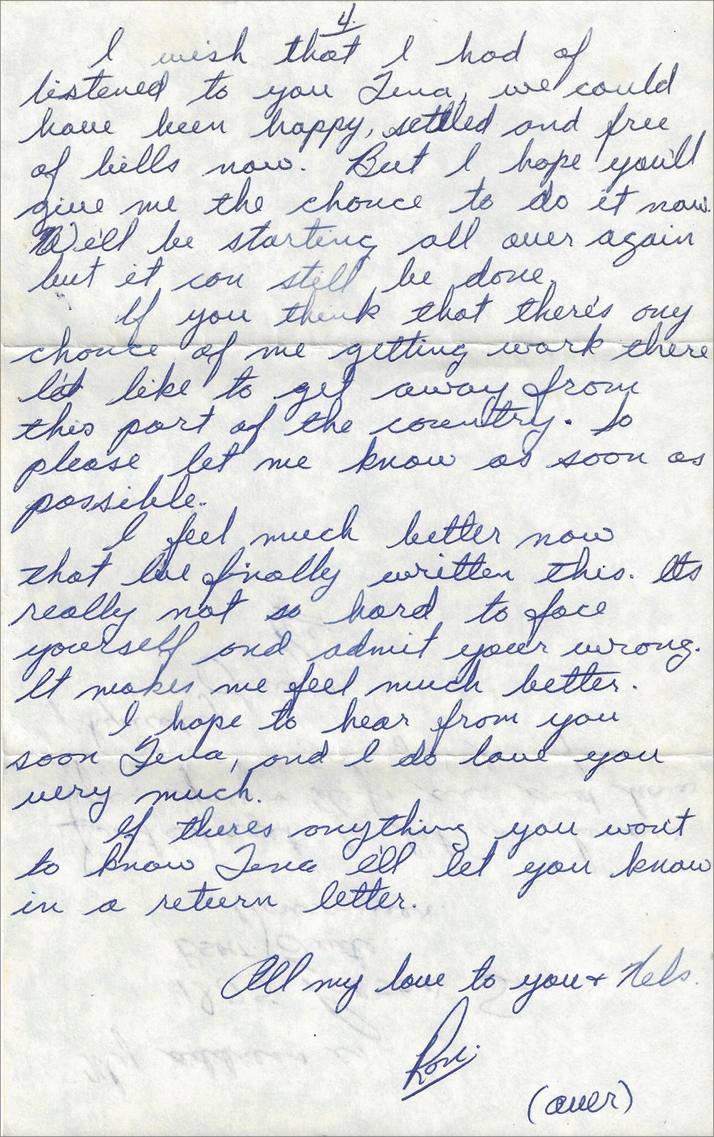 I wish that I had of [sic] listened to you Tena, we could have been happy, settled and free of bills now. But I hope you’ll give me the chance to do it now. We’ll be starting all over again but it can still be done.