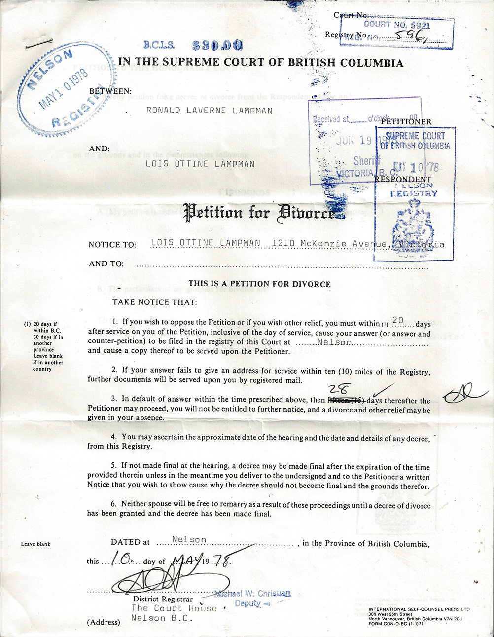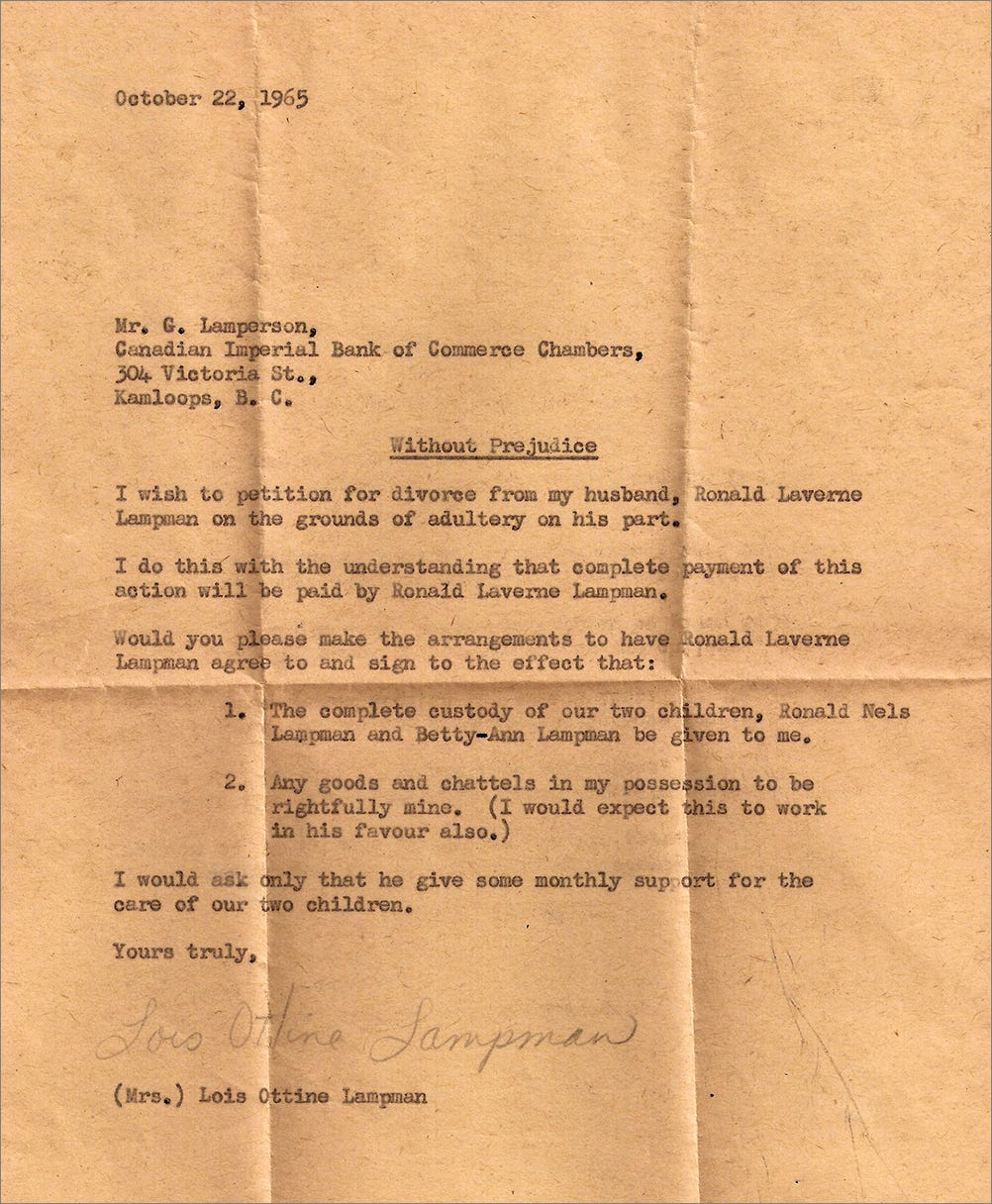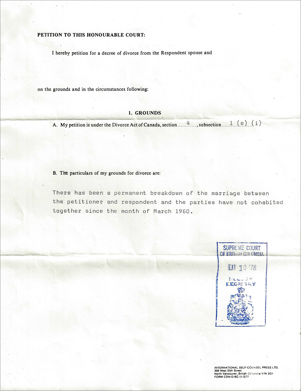 She surely did take him back, but they split again two months before my birth in May 1960. In 1965, it appears that she contacted a lawyer (perhaps his?) to petition for divorce: