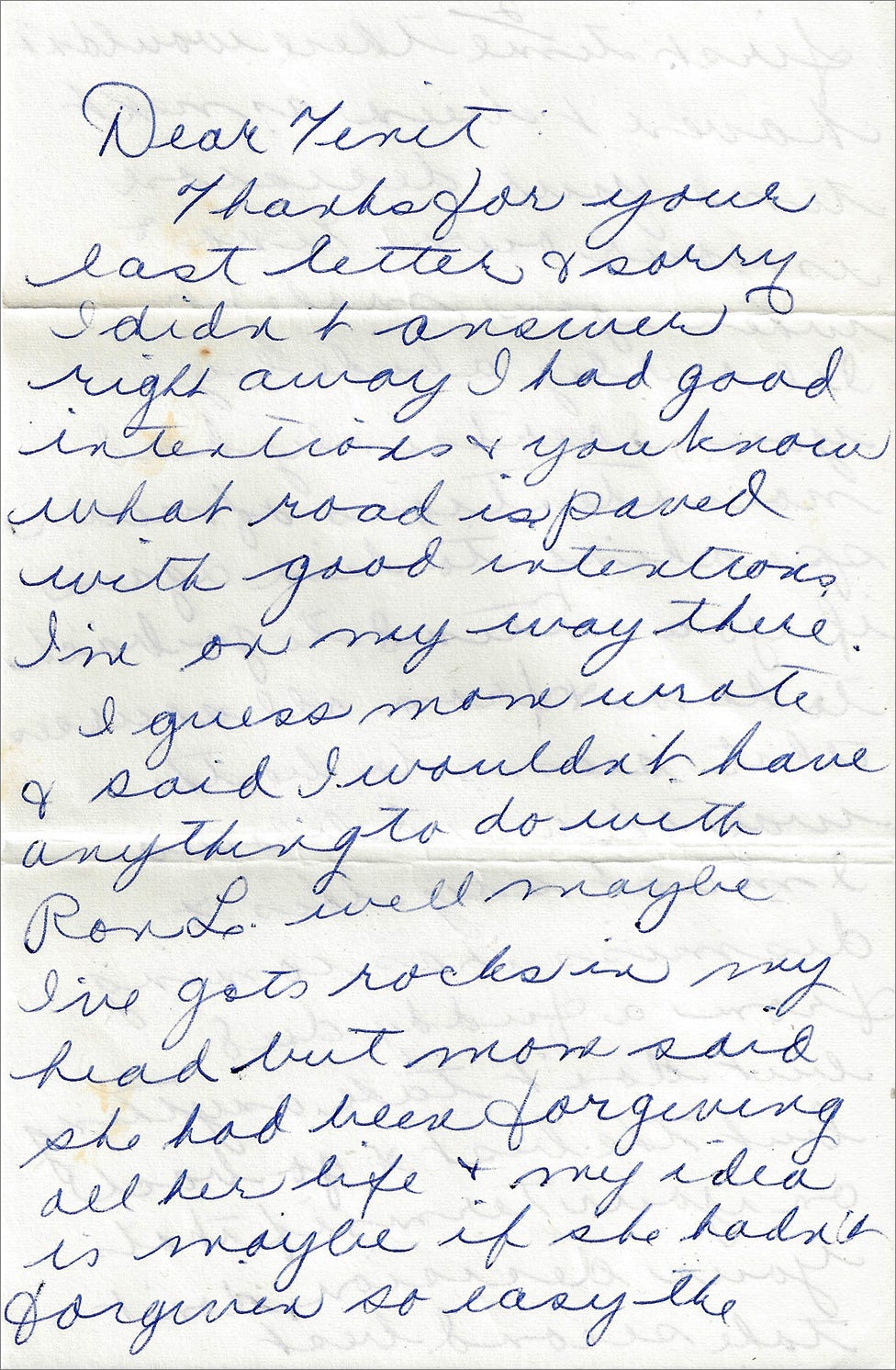 I guess Mom wrote & said I wouldn’t have anything to do with Ron L. Well maybe I’ve got rocks in my head but Mom said she had been forgiving all her life & my idea is maybe if she hadn’t forgiven so easy the first time there wouldn’t have been a next time. Your decision is your own Tena & when you make it I’ll surely abide by you, I certainly had no intentions of never speaking to him again if you intend to go back to him & from all sources that seems to be the way the wind blows.